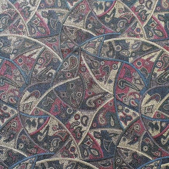 Der Purple Looking Around Aborigines Stoff besticht durch seine hochwertige, feine Baumwollqualität und ein unverwechselbares Design, das die Traumzeit-Geschichten der Aborigines erzählt. Entworfen von talentierten Aborigines KünstlerInnen, ist jedes Muster ein kleines Kunstwerk.