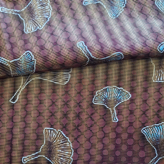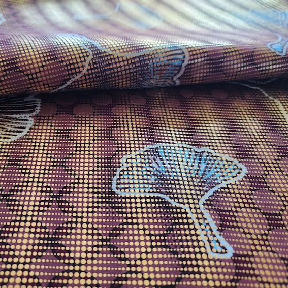 BORDEAUX GINKGO - Afrikanischer Osikani Wax Print Stoff mit Metallicprägung