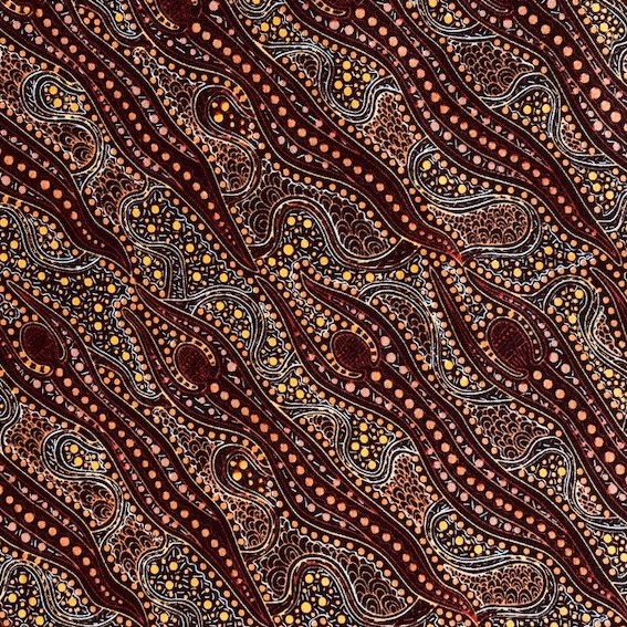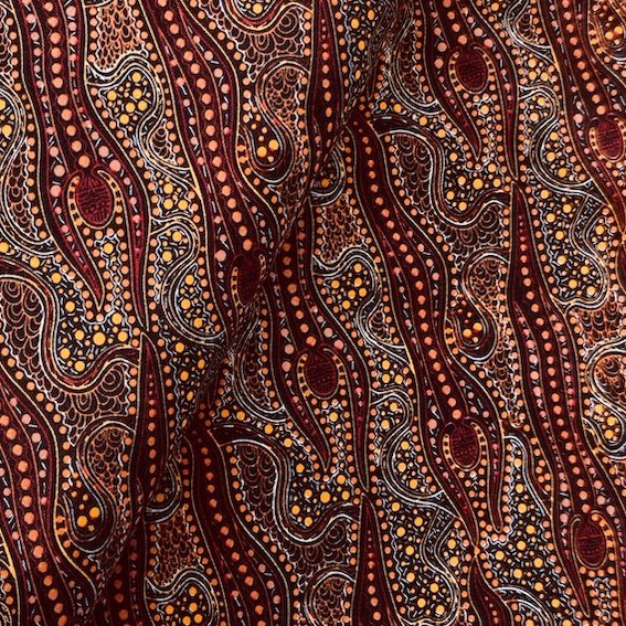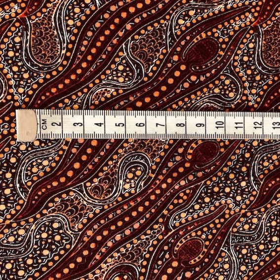 Der Brown Spirit Dreaming Stoff aus hochwertiger Baumwolle überzeugt mit seinem einzigartigen Aborigines Design. Jedes Muster ist ein kunstvolles Meisterwerk, das eine tiefgründige Geschichte der Traumzeit erzählt, entworfen von talentierten Aborigines KünstlerInnen.