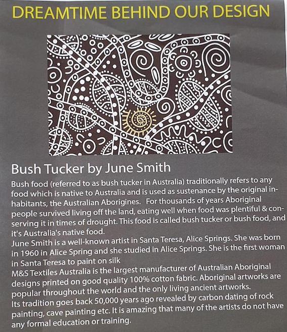 Der Bush Tucker Aborigines Stoff ist ein hochwertiger, feiner Baumwollstoff mit einem einzigartigen Design, das die kulturellen Wurzeln der Aborigines widerspiegelt. Jedes Muster erzählt eine Geschichte der Traumzeit, entworfen von talentierten Aborigines KünstlerInnen.