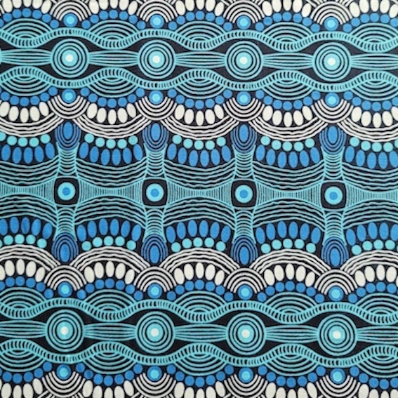 Bringen Sie mit dem DESERT FLORA BLUE Stoff die Kunst der Aborigines in Ihre Designs – jetzt exklusiv im ETHNOstoffe Onlineshop erhältlich!