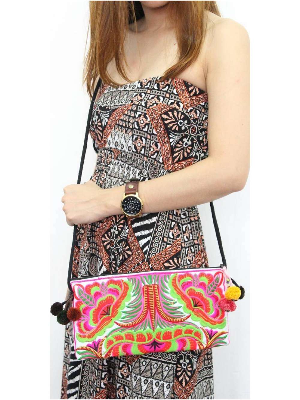 Diese wunderschöne bunte Umhängetasche wurde von dem Bergvolg Hmong aus Nordthailand hergestellt. Sie ist der ideale Sommerbegleiter und setzt durch die bunten Stickereien Akzente.