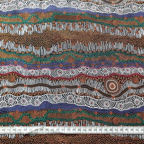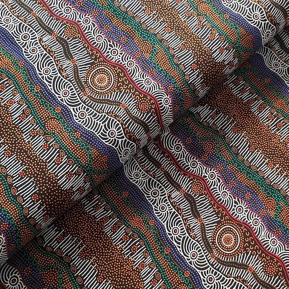 Der Gathering by the Creek Stoff beeindruckt mit hochwertiger, feiner Baumwolle und einem außergewöhnlichen Aborigines Design. Jedes Muster ist ein Kunstwerk, das eine faszinierende Geschichte aus der Traumzeit erzählt.