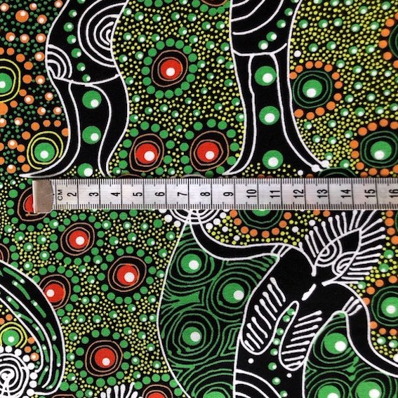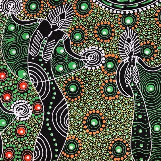 Der Green Dancing Spirit Aborigines Stoff aus Australien ist ein hochwertiger, feiner Baumwollstoff, der mit einzigartigem Design und tiefgründiger Bedeutung begeistert. Jedes Muster erzählt eine kraftvolle Geschichte aus der Traumzeit und wurde von talentierten Aborigines KünstlerInnen entworfen.