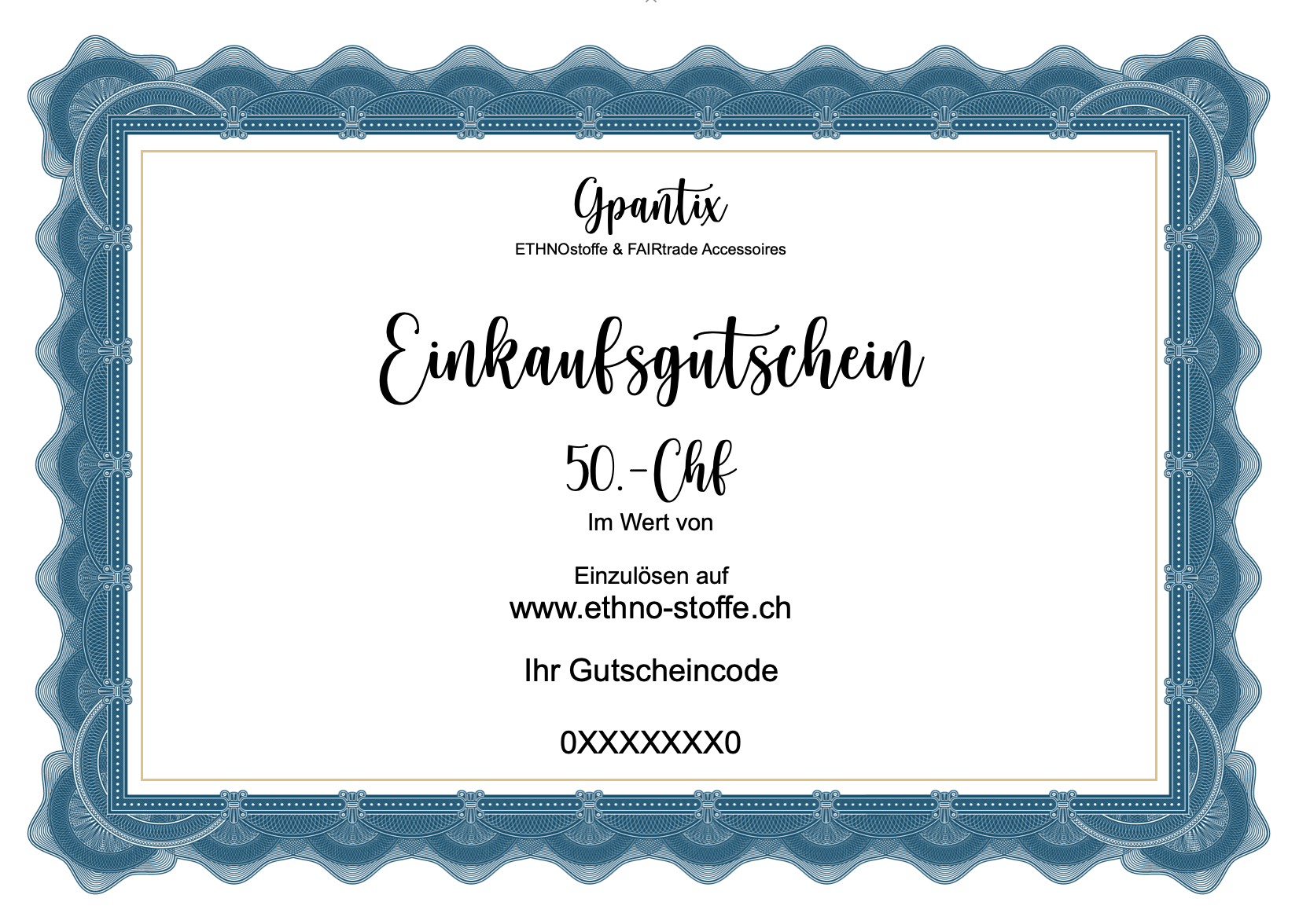 Suchen Sie nach einer Geschenkidee, die immer passt? Mit unserem Geschenkgutschein im Wert von 50.– CHF schenken Sie Freude, Individualität und freie Auswahl. Das ist das ideale Geschenk, damit sich Ihre Liebsten genau das kaufen können, was sie sich wünschen – sei es exklusive ETHNOstoffe, stilvolle Wohnaccessoires oder weitere besondere Produkte aus unserem Onlineshop.