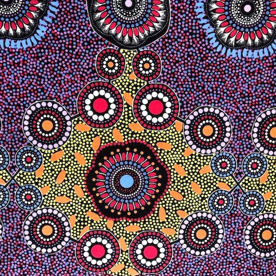 Entdecken Sie den MEETING PLACES Aborigines Stoff aus Australien – ein hochwertiger, feiner Baumwollstoff mit einem einzigartigen Design, das tief in der Geschichte und Kultur der Aborigines verwurzelt ist. Jedes Muster erzählt eine bedeutungsvolle Geschichte der Traumzeit, die von talentierten Aborigines KünstlerInnen geschaffen wurde.