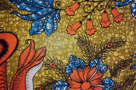 Druck: Waxprint Verfahren mit zusätzlicher Metallicprägung auf einer Seite.