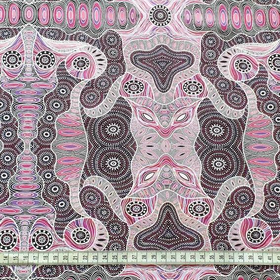 Entdecken Sie den PINK REGENERATION Aborigines Stoff aus Australien – ein hochwertiger Baumwollstoff mit einem einzigartigen Design, das Geschichten aus der Traumzeit erzählt. Jedes Muster wurde mit viel Liebe und Detail von Aborigines KünstlerInnen entworfen und ist ein wahres Kunstwerk. Dieser außergewöhnliche Stoff eignet sich perfekt für die Kreation von Blusen, Tunikas, Kleidern sowie für Innendekoration und Patchwork-Projekte. Setzen Sie auf Stil und Tradition mit diesen exklusiven Stoffen aus Australien und verleihen Sie Ihren Designs einen ganz besonderen Touch.