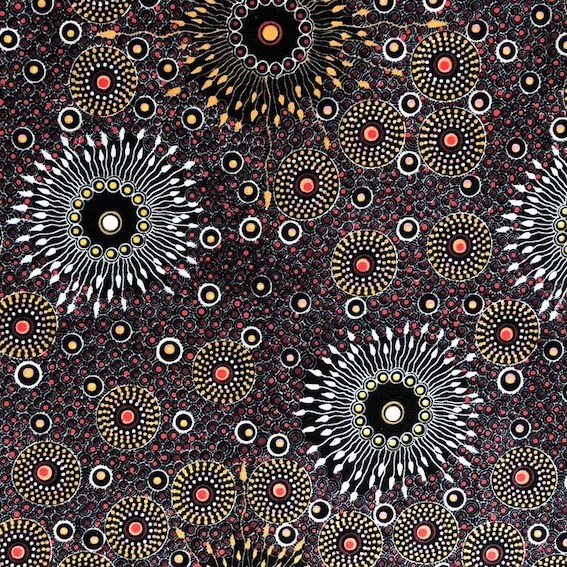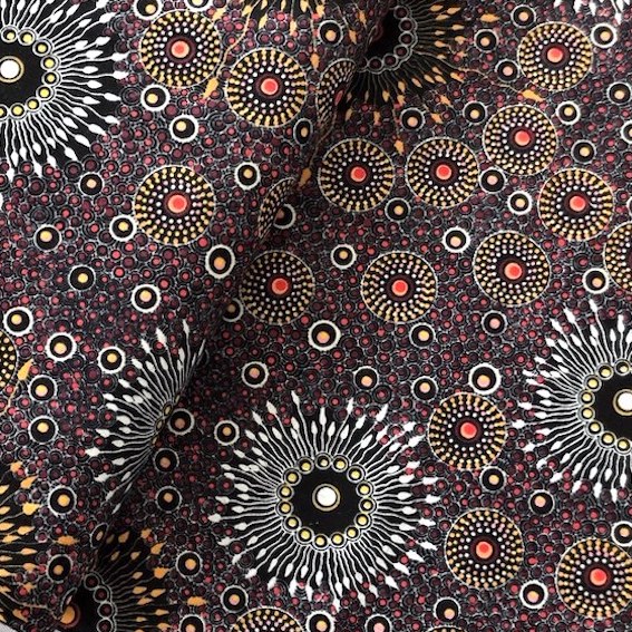 Der Red Onion Dreaming Aborigines Stoff ist ein hochwertiger, feiner Baumwollstoff, der mit einem einzigartigen Design aus Australien begeistert. Jedes Muster erzählt eine faszinierende Geschichte der Traumzeit, entworfen von talentierten Aborigines KünstlerInnen.