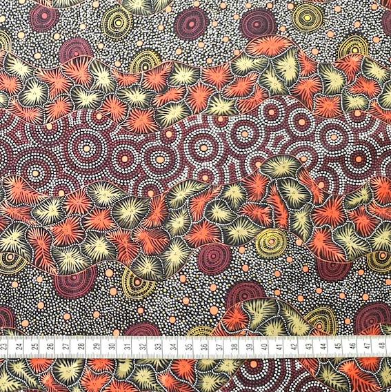 Entdecken Sie den RED WILD SEED & WATERHOLE Aborigines Stoff aus Australien – ein hochwertiger Baumwollstoff mit einem einzigartigen Design, das von Aborigines KünstlerInnen entworfen wurde. Jedes Muster erzählt eine fesselnde Geschichte der Traumzeit und lässt sich als wahres Kunstwerk bezeichnen.