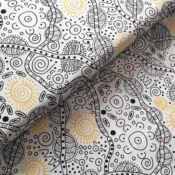 Entdecken Sie den WHITE BUSH TUCKER Aborigines Stoff – ein hochwertiger, feiner Baumwollstoff aus Australien, der mit einzigartigen Aborigines Designs begeistert. Jedes Design ist ein wahres Kunstwerk, das die faszinierenden Geschichten der Traumzeit erzählt und von talentierten Aborigines KünstlerInnen entworfen wurde. Der Stoff eignet sich hervorragend für die Herstellung von Blusen, Tunikas, Kleidern sowie kreativer Innendekoration und Patchwork. Bringen Sie mit diesem Stoff einen Hauch australischer Kultur in Ihre Designs und verleihen Sie Ihren Projekten einen ganz besonderen, exotischen Touch.