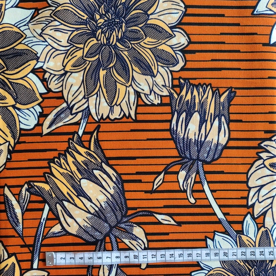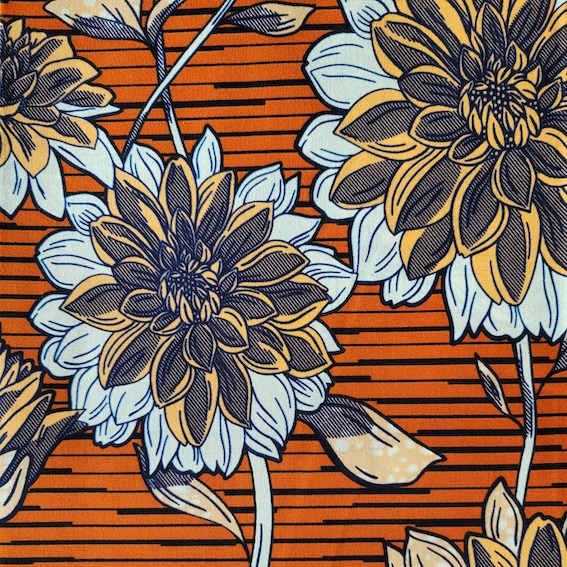 Der YELLOW DAHLIAS Wax Print Stoff kombiniert ein ausdrucksstarkes florales Muster mit einer harmonischen Farbpalette aus warmem Braun und leuchtendem Gelb. Inspiriert von der Schönheit blühender Dahlien, bringt dieser Stoff Eleganz und Natürlichkeit in jedes Design. Gefertigt aus 100 % hochwertiger Baumwolle, überzeugt er durch seine weiche Haptik, strapazierfähige Struktur und brillante Farbintensität, die auch nach häufigem Waschen erhalten bleibt.
